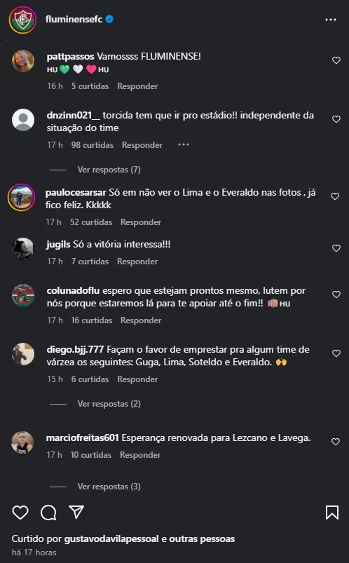 “Só em não ver o Lima e o Everaldo nas fotos já fico feliz”, comentou um torcedor nas redes. Outros reforçam que o time tricolor precisa jogar com raça e determinação, lembrando que o apoio será constante, desde que a equipe corresponda dentro de campo.