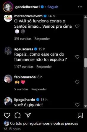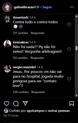 A torcida não perdoou e lotou a publicação do camisa 77 com comentários ácidos e de revolta nas redes. “Não foi nada?? Pq não foi neles!!”, desabafou um santista. Outro acrescentou: “Jesus… por poucos centímetros não vai parar no hospital. Jogada perigosíssima para ser ‘contato leve’!”.