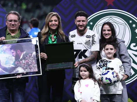Volante campeão por seis temporadas recebe placa e quadro das mãos de Leila Pereira e Paulo Buosi antes da bola rolar no Allianz Parque