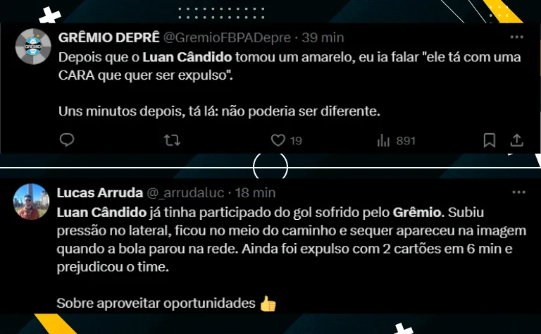 Ainda no primeiro tempo da partida, quando o Grêmio estava em vantagem no placar, com um cartão amarelo e no meio do campo, Luan Cândido deu um carrinho que resultou no seu segundo amarelo sendo expulso na primeira etapa.