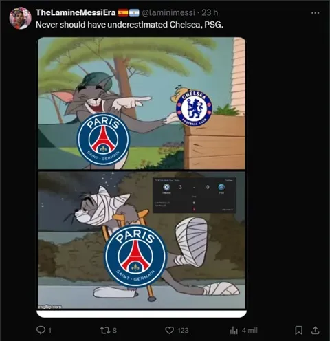 Logo após o apito final no MetLife Stadium, milhares de torcedores do Chelsea correram para os perfis oficiais do PSG no Instagram e no X (antigo Twitter) para deixar seus recados, nada amigáveis. “Mantenha-se humilde, hein!”, “PSG ainda é um clube pequeno” e “Vocês têm sorte de não terem cruzado com o Chelsea antes”.