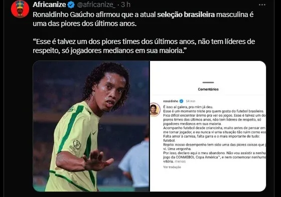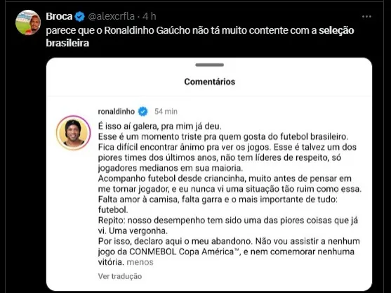 “É isso aí galera, pra mim já deu. Esse é um momento triste pra quem gosta do futebol brasileiro. Fica difícil encontrar ânimo para ver os jogos. Esse é talvez um dos piores times dos últimos anos, não tem líderes de respeito, só jogadores medianos em sua maioria.” disse R10 antes de seguir “criticando” a Seleção atual.