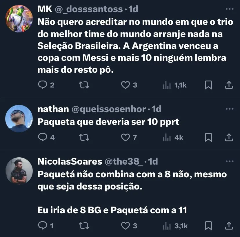 O camisa 10, que por muito tempo nos últimos anos foi de Neymar, desta vez, fica com Rodrygo. Já Vinicius Junior, companheiro no time espanhol, usará a 7. Enquanto Lucas Paquetá e Raphinha ficarão com a 8 e 11, respectivamente. Já Evanilson, que é o atacante convocado com mais gols na temporada, ficará com a 21.