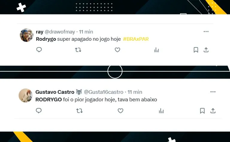 “RODRYGO foi o pior jogador hoje, tava bem abaixo”, “Já era pra ter colocado ele no lugar do Rodrygo há muuuuuito tempo” e” Rodrygo super apagado no jogo hoje”, foram algumas opiniões.