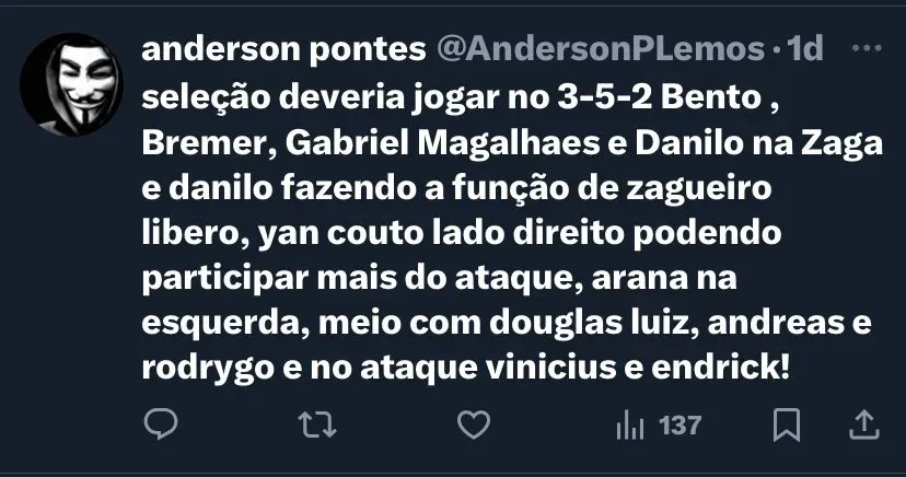O zagueiro ficou lesionado por um tempo e acabou vendo outros atletas convocados. Mas o jogador falou dessa disputa: “Estou muito feliz de dar sequência na Seleção, de estar podendo fazer parte desse projeto, desse trabalho. Nesse período, veio Beraldo, Fabrício Bruno, tem Bremer.”.