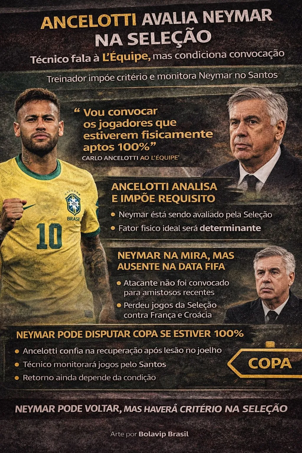 A avaliação do comandante é positiva, mas com um ponto central que pode definir tudo. Neymar ainda precisa atingir o nível físico ideal para voltar a ser convocado, algo que Ancelotti vem reforçando internamente e também publicamente desde que assumiu o cargo.