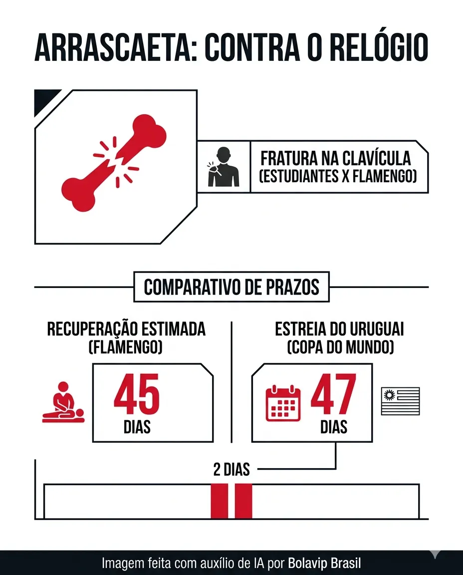Com a cirurgia pela frente, o prazo de recuperação vai definir tudo. O Flamengo trabalha com uma estimativa inicial de 45 dias para o retorno de Arrascaeta, mas o tempo real depende de como o uruguaio vai responder ao tratamento.