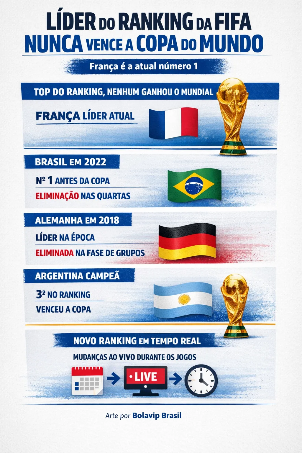 Um tabu curioso acompanha o ranking da FIFA: nenhuma seleção que chegou a uma Copa do Mundo como líder conseguiu conquistar o título, segundo O Globo. A França assumiu a primeira posição após vitórias recentes em amistosos, superando concorrentes diretos.