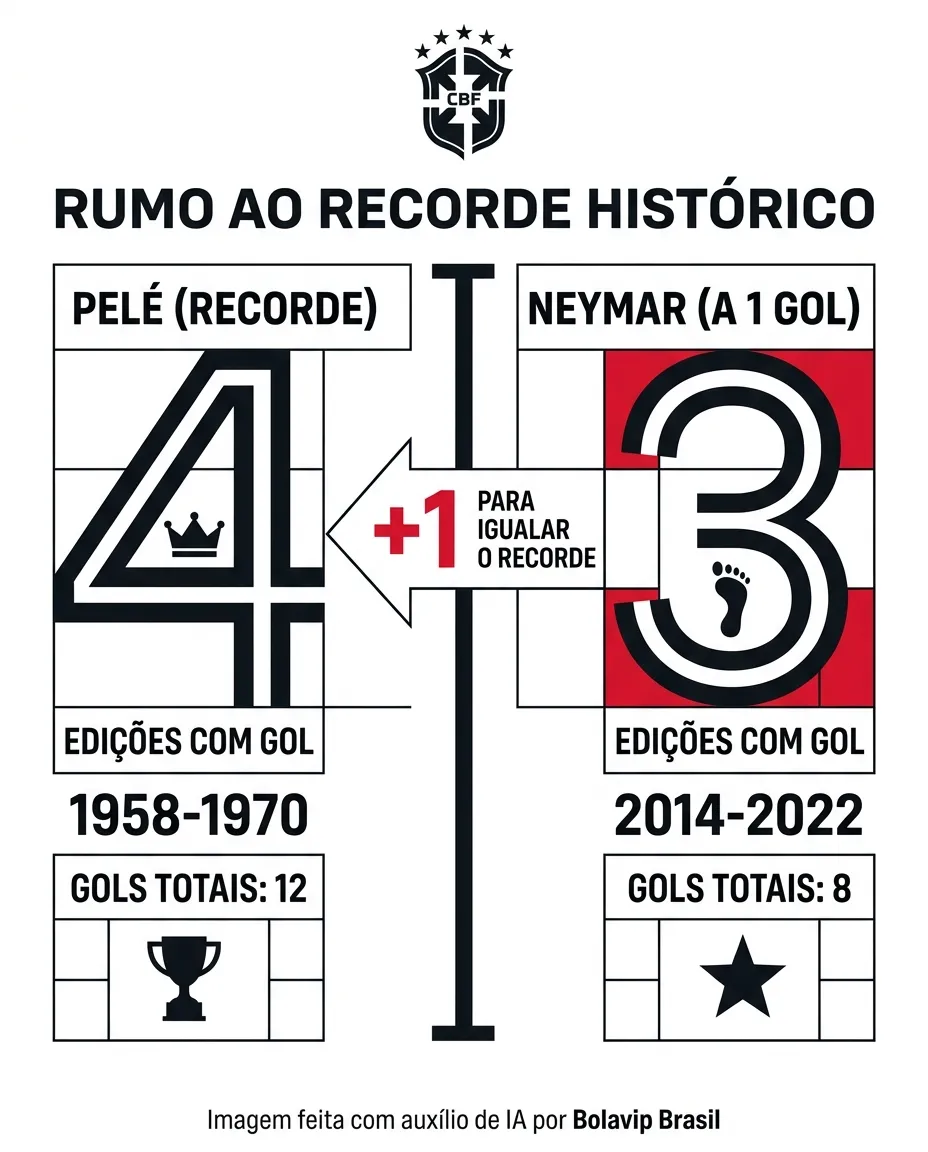 Neymar está a um gol de igualar uma marca histórica de Pelé em Copas do Mundo, um feito que reforça ainda mais sua trajetória entre os grandes nomes do futebol brasileiro. A possibilidade coloca o atacante novamente no centro das atenções às vésperas de mais uma edição do torneio.
