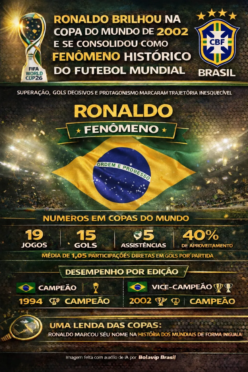 Ronaldo é considerado um jogador histórico das Copas do Mundo não apenas pelos números impressionantes, mas pela capacidade de decidir nos momentos mais importantes e superar adversidades. Sua trajetória une talento, resiliência e protagonismo em alto nível, elementos que o colocam definitivamente entre os maiores ídolos da história do futebol mundial.
