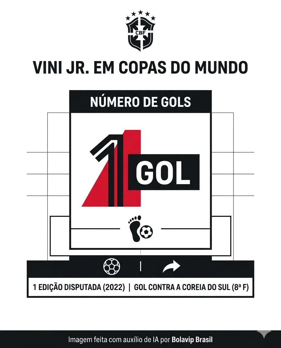 Vinícius Júnior marcou seu único gol em Copas do Mundo na edição de 2022, no jogo contra a Coreia do Sul, pelas oitavas de final. O lance veio em uma jogada bem trabalhada da Seleção, quando o atacante recebeu dentro da área e finalizou com precisão, no canto do goleiro.
