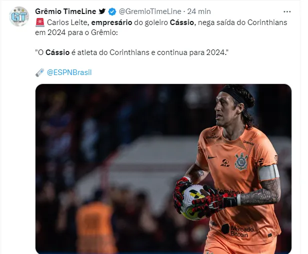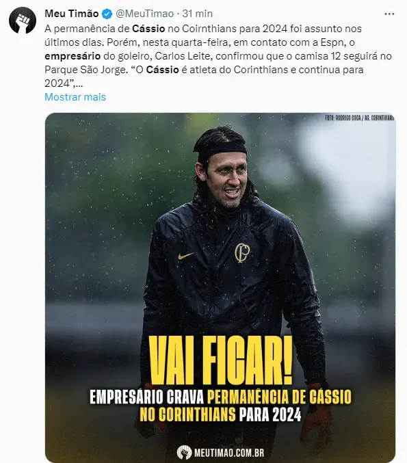 Ele iniciou sua resposta afirmando que o ídolo tem mais um ano de contrato com o Alvinegro do Parque São Jorge e vai seguir defendendo a meta da equipe. “O Cássio é atleta do Corinthians e continua para 2024”.