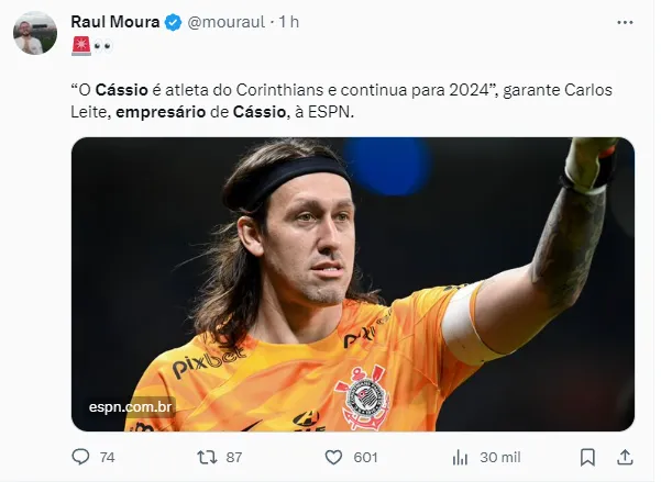 Em entrevista exclusiva para a ESPN, o empresário do medalhão do Corinthians, Carlos Leite, assegurou e cravou onde Cássio vai jogar já próxima temporada. Ele não fez rodeios e foi direto ao afirmar que o goleiro seguirá no Timão.