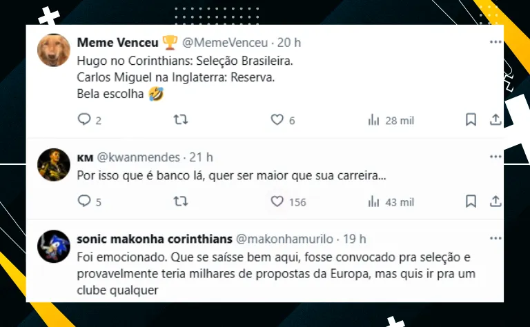 Posto isso, algo que chamou atenção da Fiel Torcida foi o fato de Carlos Miguel exaltar o fato de estar se transferindo para um clube da Premier League. Confira alguns comentários de alvinegros sobre o tema:
