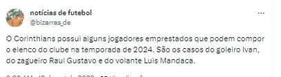 No site Gazeta Esportiva, foram publicados quatro nomes que podem não seguir nos seus respectivos times e voltarem a fazer parta do Timão em 2024. São eles: o goleiro Ivan, o zagueiro Raul Gustavo, o volante Mandaca e o atacante Eduardo Tanque.