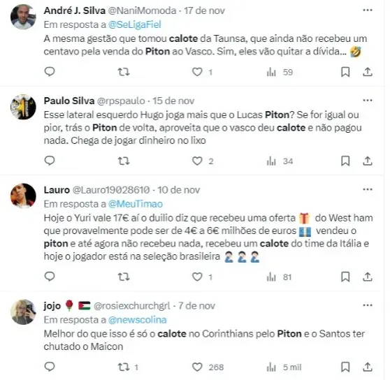 “Assim como somos pressionados por credores, nós também pressionamos. A gente está cobrando, tomando providenciais, fomos a algumas instâncias importantes com o Vasco e tenho a expectativa da gente chegar a um acordo“, disse o diretor ao Meu Timão.