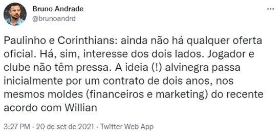 Andrade diz que o Corinthians sinaliza oferecer dois anos de contrato a Paulinho, com a possibilidade de prorrogar por mais um, além de um salário de R$ 800 mil na primeira temporada, com um aumento de R$ 200 mil na segunda, totalizando R$ 1 milhão. Porém, o negócio só sairia em janeiro de 2022.