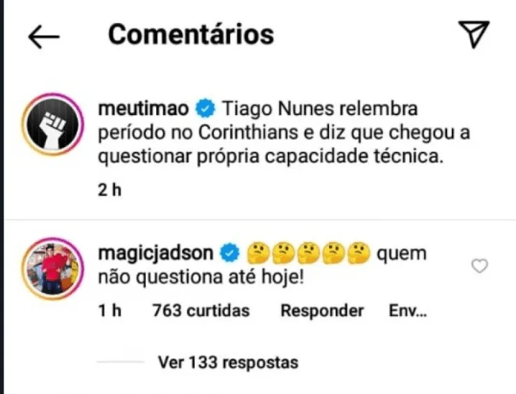 Sobre o assunto, Jadson comentou em postagem realizada pelo portal”MeuTimão”, ironizando a fala do técnico:“Quem não questiona até hoje”, escreveu o meia de 38 anos.