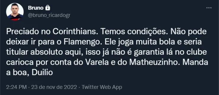 “Temos condições. Não pode deixar ir para o Flamengo. Ele joga muita bola e seria titular absoluto aqui, isso já não é garantia lá no clube carioca por conta do Varela e do Matheuzinho. Manda a boa, Duilio”, disse um corinthiano na web.
