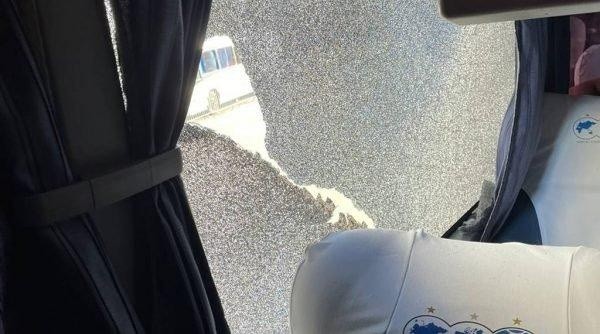 Um torcedor do Inrternacional aremessou uma pedra no ônibus do Grêmio, que acabou acertando o volante Matías Vilassanti. Foto: Reprodução/ Twitter