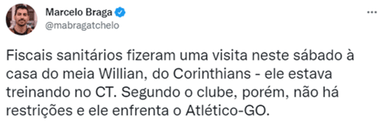 Willian não foi encontrado, pois estava treinando no CT Joaquim Grava, visando a partida contra o Atlético-GO. Porém, os agentes sanitários deixaram um telefone de contato, e o clube já ligou para tentar resolver a situação. Segundo o Departamento Jurídico do Corinthians, a situação não impedirá o camisa 10 de estrear amanhã.