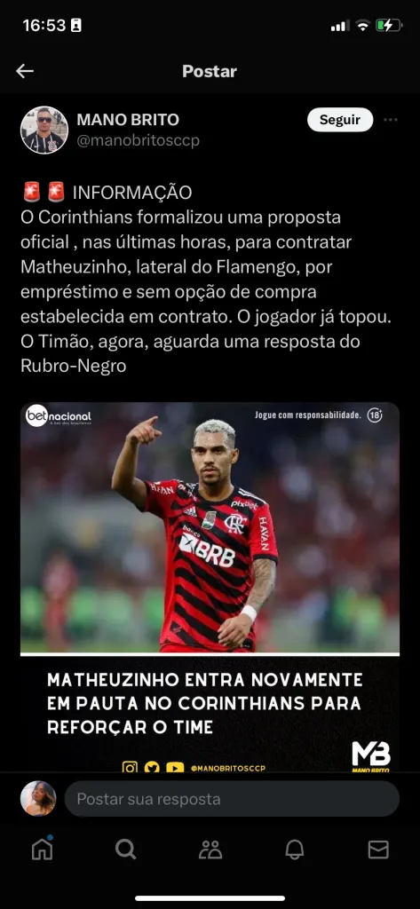 Ainda buscando reforços, o Corinthians está perto de fechar com mais uma. Dessa vez é o lateral-direito do Flamengo, Matheuzinho, que despertou interesse no Timão.