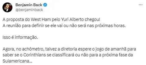 “A proposta do West Ham pelo Yuri Alberto chegou! A reunião para definir se ele vai ou não será nas próximas horas. Isso é informação. Agora, no ‘achômetro’, talvez a diretoria espere o jogo de amanhã para saber se o Corinthians se classificará ou não para a próxima fase da Sulamericana…”, afirmou o jornalista em uma postagem em suas redes sociais.