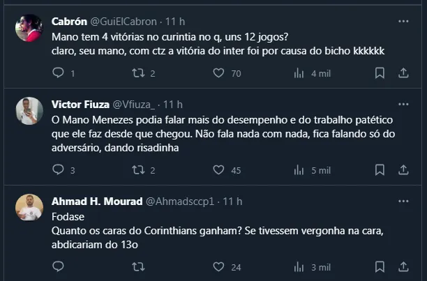 Isto é, além de diminuir o mérito do adversário, Mano também jogou contra o seu próprio grupo de jogadores e contra a torcida, “enfraquecendo” o Alvinegro. Não à toa, a fala não caiu bem na fiel torcida do Corinthians.