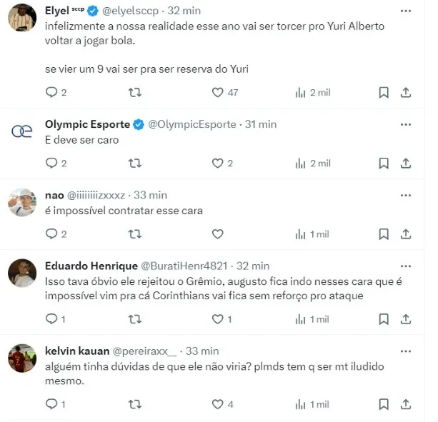Vale lembrar que a diretoria está no mercado em busca da contratação de um centroavante para a sequência da temporada, mesmo contando com Yuri Alberto em seu plantel.