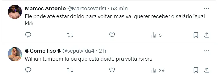 Quando foi apresentando a equipe, Igor Coronado externou o desejo de atuar com um antigo companheiro de equipe e um velho conhecido da Fiel no Corinthians. “O Romarinho está doido para voltar. Ele ama esse clube, ama a história dele no Corinthians. Seria um sonho para mim voltar a fazer parceria com ele aqui, embora isso não caiba a mim”, apontou.