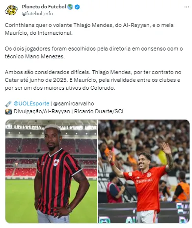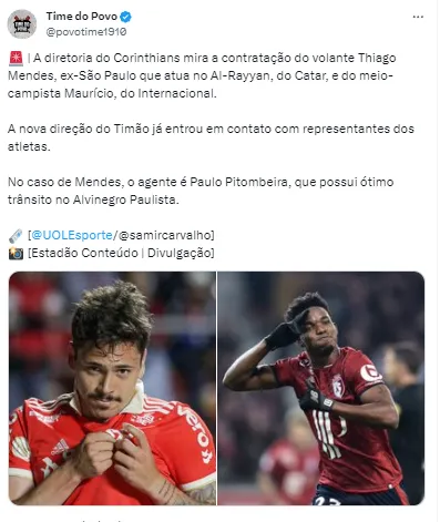 Os dois nomes foram aprovados pelo treinador Mano Menezes. Maurício, que está no Inter, seria uma opção para o lado de ataque e Mendes chegaria para ser um homem de referência no meio-campo do Corinthians para a temporada de 2024.