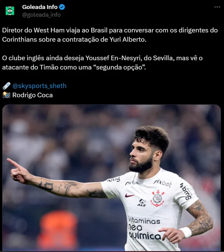 Agora, o West Ham da Inglaterra está mandando uma comitiva liderada pelo Diretor da equipe para tirar o atacante Yuri Alberto, do Brasil. O representante da Premier League tem no jovem de 22 anos uma espécie de Plano B, tendo em vista, o desejo do clube por Youssef En-Nesyri, do Sevilla.