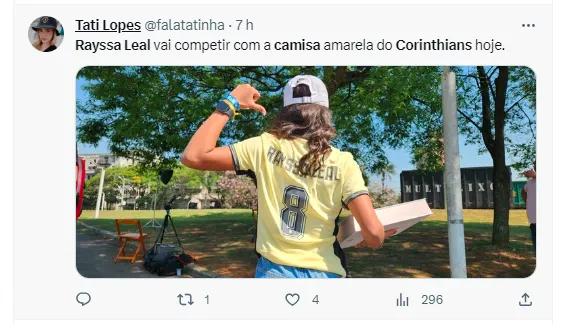 Em meio a isso, uma situação fora das quatro linhas chamou a atenção de muitos torcedores. Neste sábado (23), a medalhista olímpica e corinthiana assumida, Rayssa Leal participou da semifinal do STU, o circuito nacional de skate, e não decepcionou. A jovem de 15 anos foi à final, se classificando em primeiro lugar entre os 16 que participaram dessa etapa. Porém, o Time do Povo esteve envolvido no dia dela.