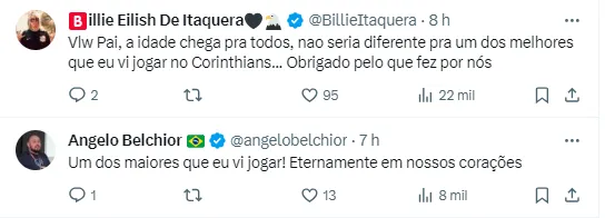 “É com lágrimas nos olhos que me despeço de vocês. Eu sabia que esse dia chegaria, mas a verdade é que nunca estamos preparados para a despedida. Fui muito feliz todos esses anos que estive no Corinthians, agradeço imensamente a todos que fizeram parte dessa caminhada, obrigado Duílio, Alessandro e Roberto Andrade pela confiança e por me dar a oportunidade de vestir essa camisa novamente”, iniciou.