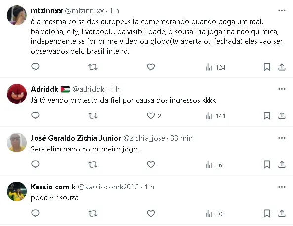 “A maioria dos meus amigos é corintiana. Tem a brincadeira, mas penso na grandeza do time, imagina o Corinthians fazendo um jogo em Sousa? Como vai ser bom para a cidade, para o futebol paraibano. Depois ter o jogo em Itaquera, importante para os jogadores, para o clube. Se a gente pudesse escolher… mas é sorteio“, afirmou o treinador em entrevista à Globo.