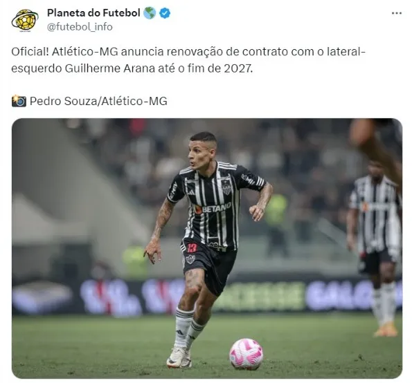 “A história segue sendo escrita! O Galo renovou o contrato do lateral Guilherme Arana, ídolo do Clube, até dezembro de 2027”, iniciou o perfil oficial do Galo.