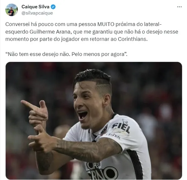 Na noite desta quarta-feira (4), o jornalista Samir Carvalho agitou os corações do corinthianos falando sobre uma possível volta de Guilherme Arana. pesar de já ter sido procurado pelo Atlético-MG para renovação do seu contrato, Guilherme Arana tem o desejo de retornar ao Corinthians, informou o comunicador.