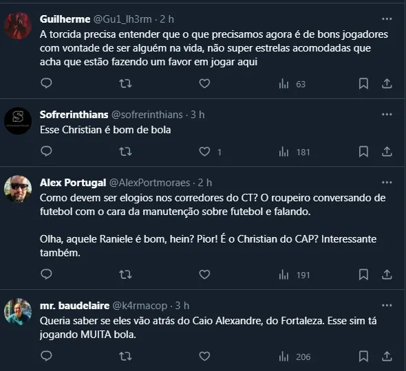 Dito isso, por mais que o Brasileirão ainda esteja na reta final, algumas possibilidades de mercado começam a surgir internamente no CT Parque Ecológico. Dentre eles, dois nomes da Série A.