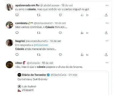 Não foi exatamente a melhor das noites para Cássio, o que também significa que o defensor tenha cometido erros graves. O que é certo é que uma ala mais irritada da Fiel não tolerou os quatro gols sofridos pelo guarda-redes, enchendo as redes sociais de críticas pelo que acontecia direto da Neo Química arena. O Corinthians segue sob o risco de voltar ao Z-4 na tabela e a torcida do Timão pede mudanças imediatas a Luxemburgo.