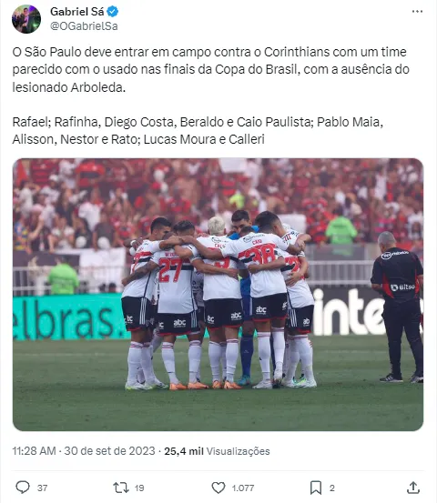 De acordo com o jornalista em publicação no Twitter, o São Paulo deve vir com a mesma cara que bateu o Flamengo na Copa do Brasil e que vem acumulando vitórias no Morumbi. O Corinthians deve encarar um Tricolor escalado da seguinte forma: Rafael; Rafinha, Diego Costa, Beraldo e Caio Paulista; Pablo Maia, Alisson, Nestor e Rato; Lucas Moura e Calleri. Antes mesmo de Mano Menezes estrear, os desafios já começam.