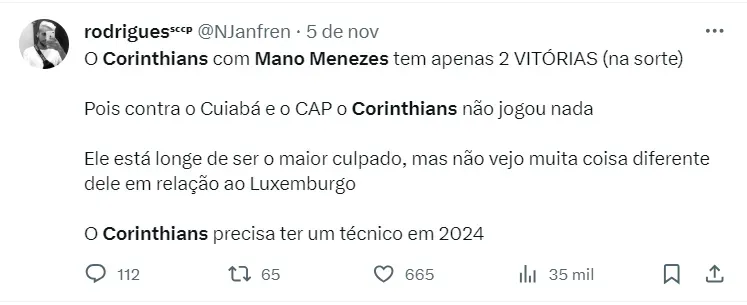 “O Corinthians não merece cair. Sabe por quê? Porque o Corinthians é tão grande, mas tão grande, mas vocês fizeram o Corinthians ser tão pequeno, tão pequeno. Vocês, jogadores”, desabafou. Destacou o ex-jogador apontando que o Santos, que vive um momento pior na temporada, venceu mais que o Timão na competição.
