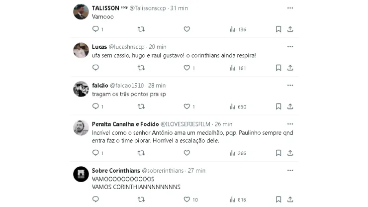 O Corinthians conta com os seguintes jogadores no banco de reservas: Cássio, Caetano, Fausto Vera, Giovane, Pedro Raul, Fagner, Biro, Arthur Sousa, Raul Gustavo, Ryan, Hugo e João Pedro
