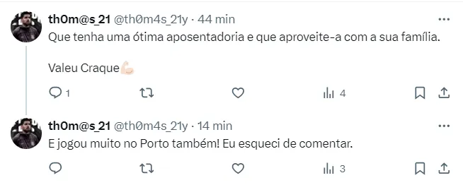 “Ainda é cedo para explicar os motivos, algo que farei adiante, pois ainda tenho contrato e quero honrá-lo como sempre fiz por todos os clubes pelos quais defendi. Mas por respeito aos clubes que têm me procurado para futuro e até mesmo ao meu clube atual, quis vir aqui adiantar esse assunto e me pronunciar com o coração aberto e honestidade”, escreveu.