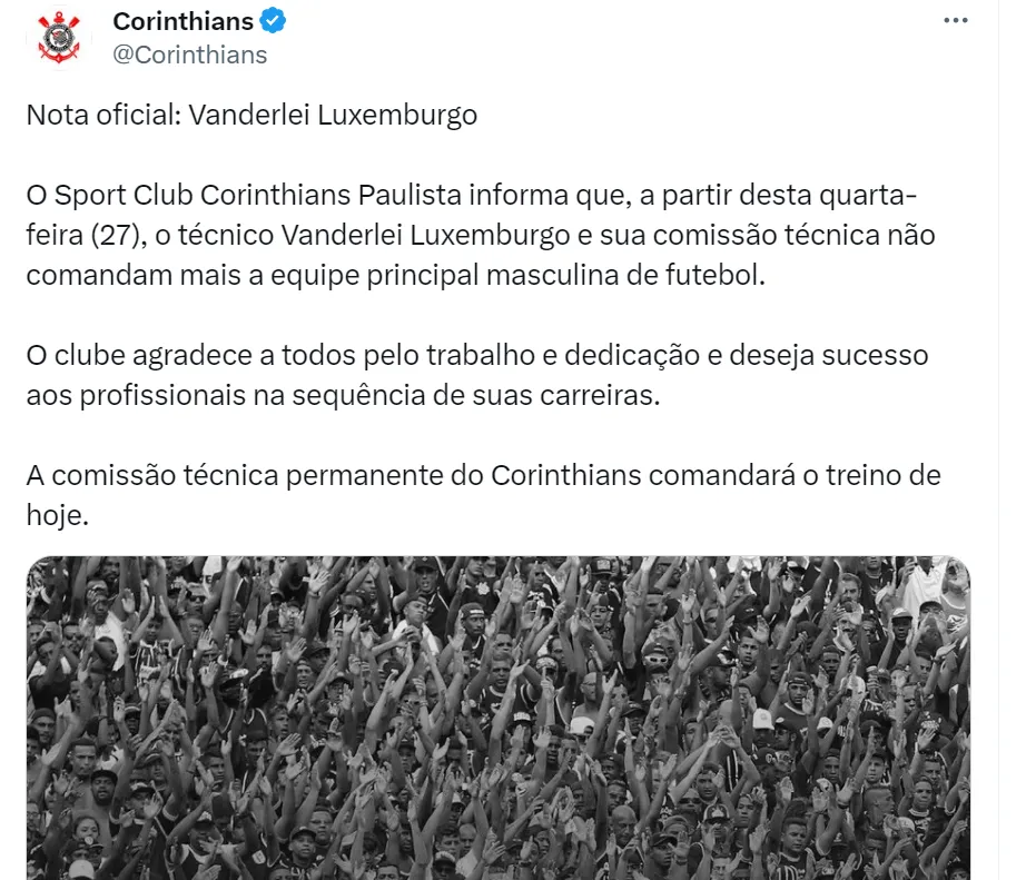 Na noite da última terça-feira (26), o Corinthians teve atuação fraca contra o Fortaleza e ficou no empate de 1 a 1 pelo jogo de ida da semifinal da Copa Sul-Americana, na Neo Química Arena. Descontente com o desempenho da equipe não só diante do Clube do Pici, mas também em outras partidas, a diretoria do Alvinegro do Parque São Jorge decidiu nas últimas horas pela demissão de Vanderlei Luxemburgo.