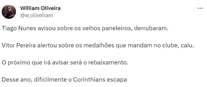 A situação do Corinthians se agrava ao olhar para os principais concorrentes”. Para Inter, Bahia e Cruzeiro, embora a permanência não seja garantida, a situação já é um pouco melhor após a 28ª rodada, que garante uma sobrevida no Brasileirão. O Colorado, com uma goleada vexatória para cima do Santos, por 7 a 1. A Raposa, com a vitória por 1 a 0 no primeiro Clássico Mineiro da Arena MRV. E o Tricolor de Aço vencendo o Leão do Pici por 2 a 0 e chegando à terceira vitória consecutiva.