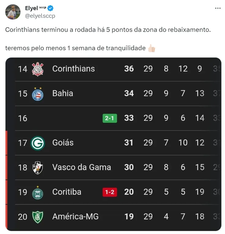 Com isso, o Corinthians precisa garantir mais dez pontos até a 38ª rodada para permanecer na primeira divisão e atingir o “número mágico”. Assim, o Timão terá nove rodadas para conquistar a pontuação necessária.