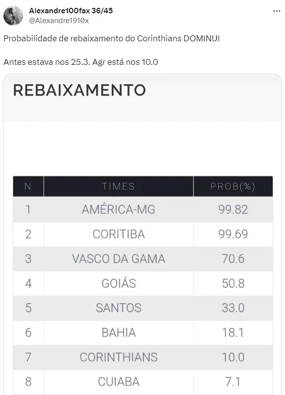 Apesar de ainda carregar 10% de chance de ser rebaixado para a segunda divisão, o Corinthians vive um momento mais tranquilo do que boa parte de seus rivais na fuga da Série B do Brasileirão.