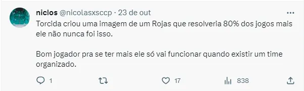 Porém, foi só. Desde então, Rojas não rendeu mais pelo Time do Povo. A expectativa era tanta que ele ganhou a camisa 10, após a saída de Róger Guedes. Vestimenta que já foi usada por jogadores como Rivellino, Neto, Carlitos Tevez, Edílson Capetinha, entre outros. Apesar de ter se destacado pelo Racing jogando pela ponta direita, para sempre cortar para o meio e bater com a esquerda, a função não deu certo pelos paulistas. Aliás, é muito pouco.