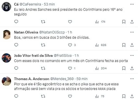 Contudo, a grande revelação de Andrés Sanchez, veio na sequência, quando anunciou qual cargo o espera, se André Negão for o próximo presidente do Corinthians. “No futebol serei eu (o diretor) no primeiro ano. Pronto, já dei de primeira mão aqui”, afirmou, se referindo ao programa do Benja.