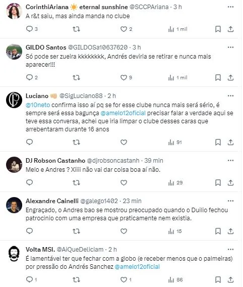 Neste contexto administrativo, o presidente Augusto Melo teve uma reunião com o ex-mandatário Andrés Sanchez, na última quinta-feira (11), no Parque São Jorge. A informação é da Gazeta Esportiva, também reverberada no portal Meu Timão.